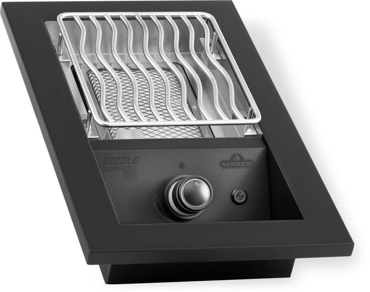 The Infrared SIZZLE ZONE™ can be used to produce the perfect sear on meat or used to create sides and sauces while the main grill is in use. This 10-inch drop-in Infrared SIZZLE ZONE™ burner sears succulent steaks to restaurant-quality perfection. Made from the same quality of premium stainless steel as the 700 Series built-in grills, this matte black drop-in side burner matches your custom outdoor kitchen. These burners provide stylish longevity and were built with ease of install in mind. Virtually maintenance-free 7.5-mm cooking grids deliver the iconic WAVE™ sear marks that tell your meal was cooked on a Napoleon. Ignite the burners one-handed using the JETFIRE™ instant ignition system. The ergonomic backlit control knobs which provide ambiance and safety, glowing a glorious blue and changing to red when burners are in use. The power supply kit N370-1091-SER is required for all Built-in 700 Series burners being used in an application without a Built-in 700 Series Built-in Grill in order to supply power for the backlit control knobs.