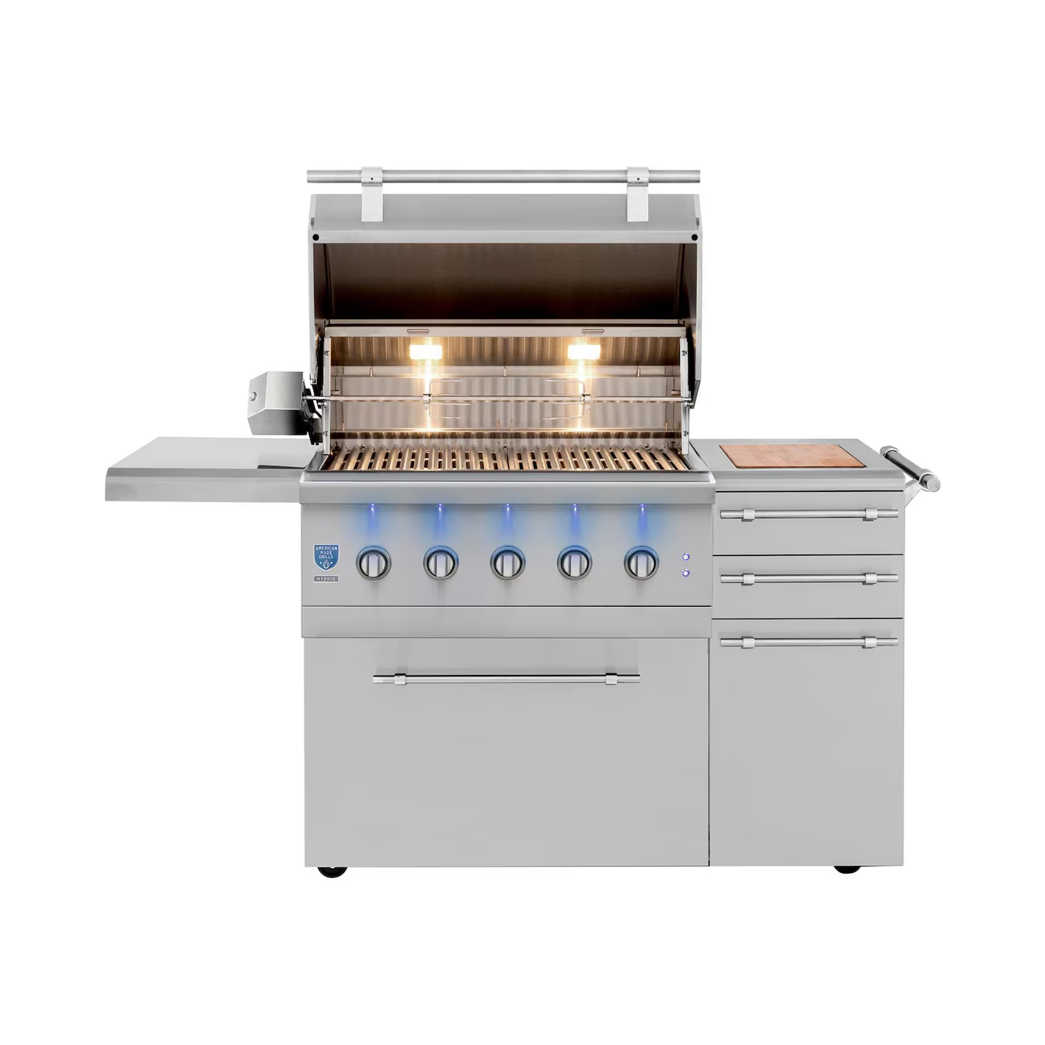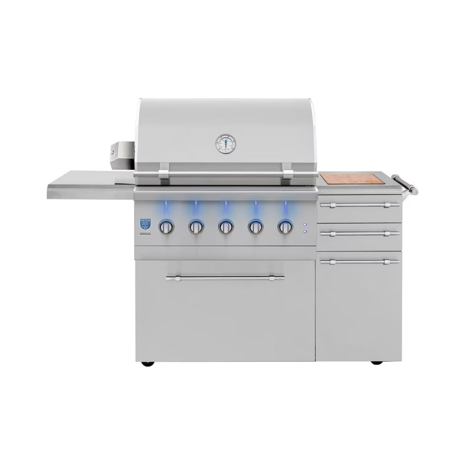Fully-Loaded Professional Cart: The grill comes on a pre-assembled 304 stainless steel cart featuring two soft-close drawers (one extra-large for fuel), a dedicated LP tank pull-out drawer (LP models), a folding side shelf with a removable cutting board, a towel bar, and heavy-duty 360° casters (two locking).