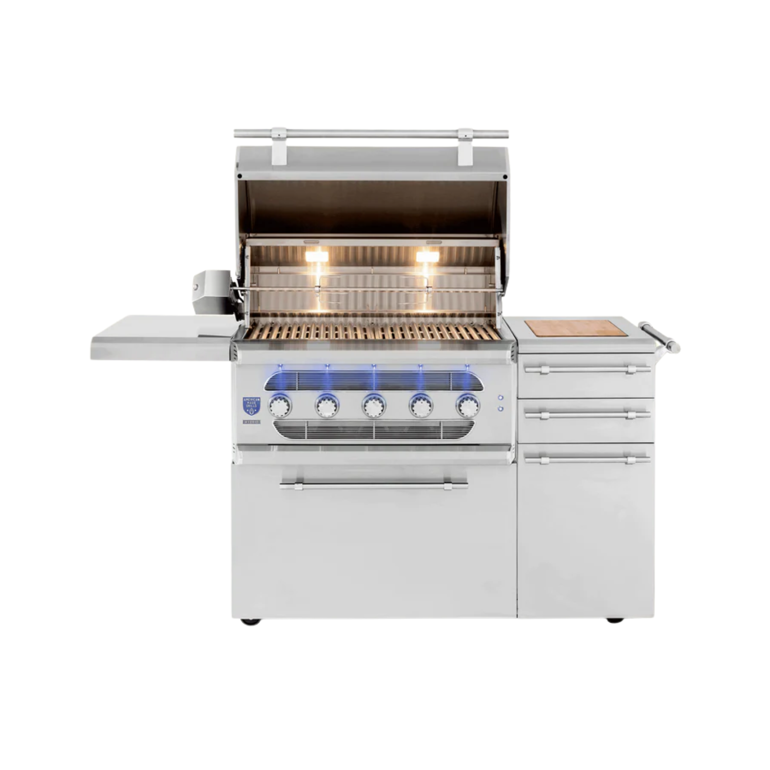 Pre-Assembled Professional Cart: The 304 stainless cart includes soft-close drawers (one extra-large for fuel), a dedicated LP tank drawer, a folding side shelf with a removable cutting board, and locking casters.